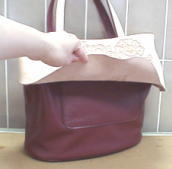 表:牛革 内側:合成皮革 本体サイズ:約H270×W330×D170(持ち手は除く) 入口はマグネット金具付き 底の形は楕円形です。 全体に柔らかな革で出来ていて、気軽に持てるトートバッグです。エプロンのような部分は、ソフトタンローの端の部分をそのまま利用しているので、自然なフレアーになっています。 ベースの色革は、エンジ・黒・茶系などでできます。エプロン部分の形は その時の革の形によって違います。 画像のものは、自分で使うことにしました。沢山入るし使いやすいです。 内ポケット2ヵ所。ひとつは携帯電話用。 |