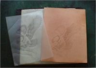 スポンジや水バケを使って革を適度に湿らせます。そして、図案を写したトレースフィルムをのせて 鉄筆でなぞり図案を革に写します。