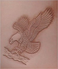 唐草模様などの伝統的な図案の場合は、ある程度 使う刻印や叩き方の基本を覚えることが大切です。この鷲の図案のようなフィギュアカービング(動物や風景などを彫ること)の場合は自由な部分が多く、作者のセンスの見せどころですね。